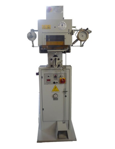 Timbratrice pneumatica su colonna per fodere e tomaia intera dotata di numeratore a caldo con 7 dischi e nastro stampante ad avanzamento automatico regolabile da 0 a 200 mm (disponibile in tutti i colori).